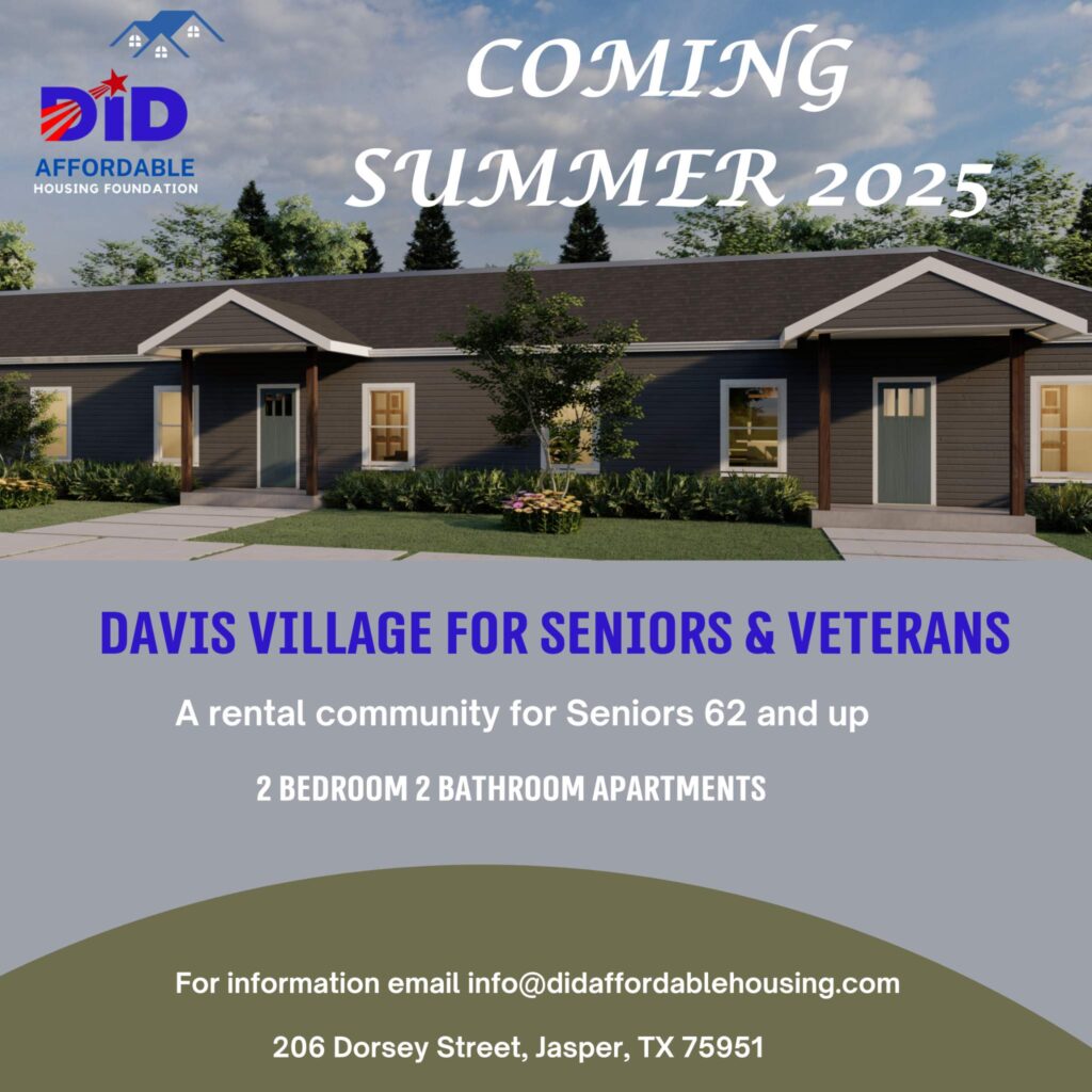 The DID Affordable Housing Foundation is proud to announce **Davis Village for Seniors and Veterans**, a transformative new construction project designed to provide quality, affordable housing for qualifying seniors and veterans. Located in the heart of **Jasper, Texas**, this development is specifically tailored to serve individuals aged **62 years and older**, offering **2-bedroom, 2-bathroom apartments** that combine comfort, accessibility, and modern living.